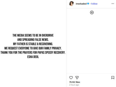 बेटी ईशा देओल ने इंस्टाग्राम पर लिखा कि उनके पिता पूरी तरह से ठीक हो रहे हैं और मीडिया द्वारा फैलायी जा रही अफवाहें पूरी तरह गलत हैं। उन्होंने फैंस से अपील की कि वे परिवार की निजता का सम्मान करें और उनके पिता के स्वास्थ्य के लिए दुआ करें।