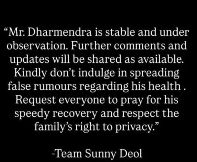सनी देओल की टीम ने लिखा है- ” मिस्टर धर्मेंद्र की हालत स्थिर है और वह डॉक्टर की निगरानी में हैं। जैसी ही कोई जानकारी मिलेगी, आप सब से साझा की जाएगी।