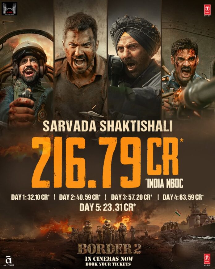 इससे पहले फिल्म ने पहले दिन 32.10 करोड़, दूसरे दिन 40.59 करोड़ और तीसरे दिन 57.20 करोड़ कमाए थे। कुल मिलाकर फिल्म का अब तक का घरेलू कलेक्शन 216.79 करोड़ तक पहुंच गया है। 1971 के भारत-पाकिस्तान युद्ध की पृष्ठभूमि पर बनी ‘बॉर्डर 2’ दर्शकों के दिलों को छू रही है। फिल्म में देशभक्ति, भावनाएं और दमदार एक्शन का संतुलन दर्शकों को सिनेमाघरों तक खींच रहा है।