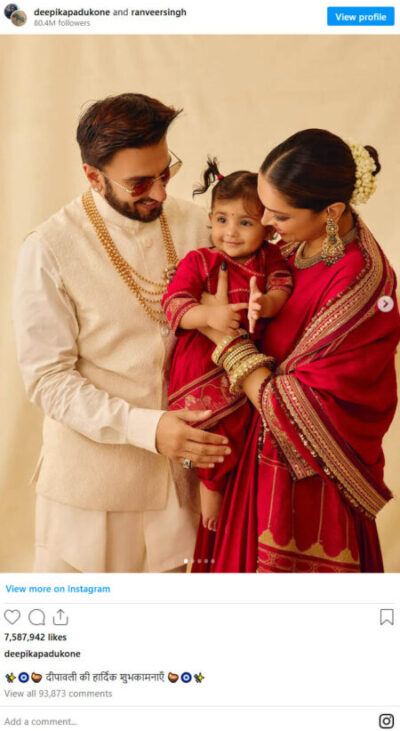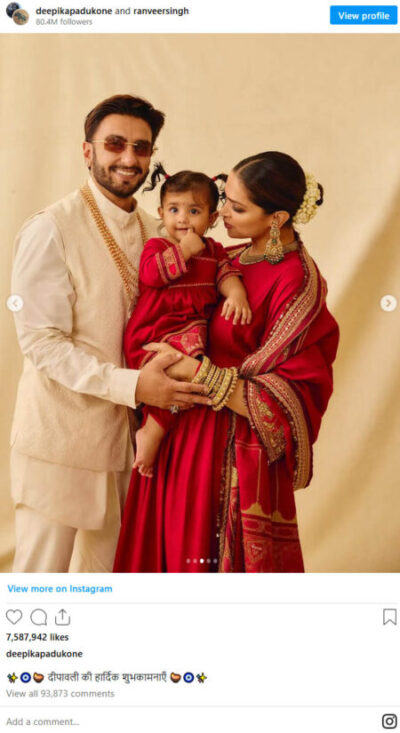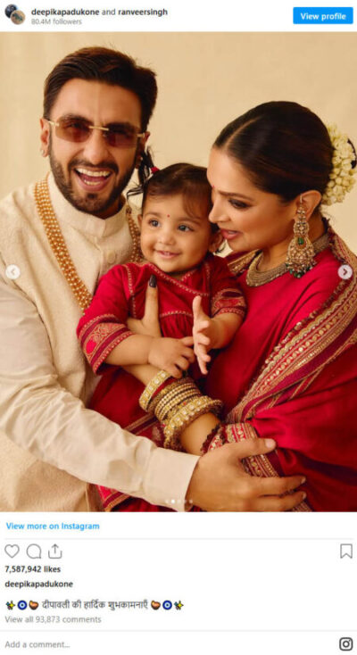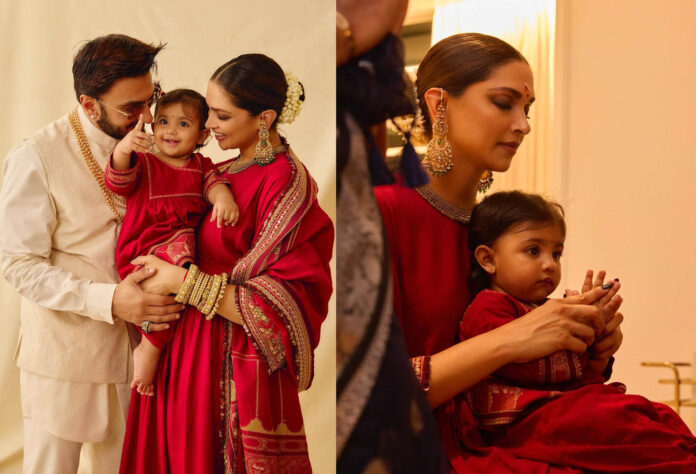 दिवाली के खास मौके पर दीपिका पादुकोण ने फाइनली बेटी की तस्वीर दिखा दी है। उनकी प्यारी सी बेटी लाल रंग की ड्रेस पहने हुए बेहद प्यारी लग रही है जिसका नाम दुआ है। दुआ ने मम्मी-पापा से मैचिंग लाल रंग के कपड़े पहने हुए हैं और दो छोटी पोनी बना रखी है।