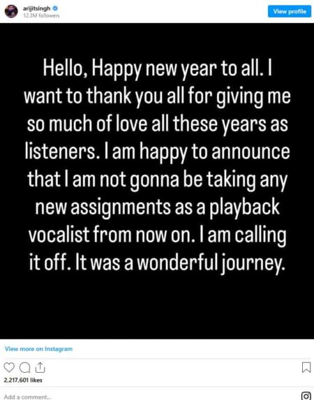 अरिजीत सिंह ने अपने रिटायरमेंट की खबर एक सोशल मीडिया पोस्ट से अपने फैंस को दी। सिंगर ने अपनी पोस्ट में लिखा, “हैलो, आप सभी को नए साल की हार्दिक शुभकामनाएं।