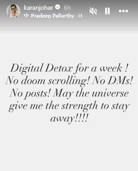 करण ने इंस्टाग्राम स्टोरी से जानकारी दी कि वह एक हफ्ते के लिए सोशल मीडिया से ब्रेक ले रहे हैं। उन्होंने हल्के-फुल्के अंदाज़ में लिखा कि अब न तो बेवजह स्क्रॉलिंग होगी, न किसी के मैसेज का जवाब और न ही कोई नई पोस्ट। साथ ही उन्होंने मज़ाकिया लहजे में ऊपरवाले से इस फैसले पर टिके रहने की ताकत भी मांगी।