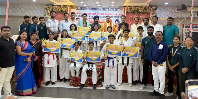 लखनऊ। चैंपियन ऑफ चैंपियंस कराटे एकेडमी के द्वारा महालक्ष्मी लॉन, इंदिरा नगर में वर्ल्ड मॉडर्न शोतोकान कराटे फेडरेशन द्वारा आयोजित कलर बेल्ट, ब्लैक बेल्ट की परीक्षा एवं उत्तीर्ण खिलाड़ियों को प्रमाणपत्र वितरण समारोह का आयोजन किया गया।