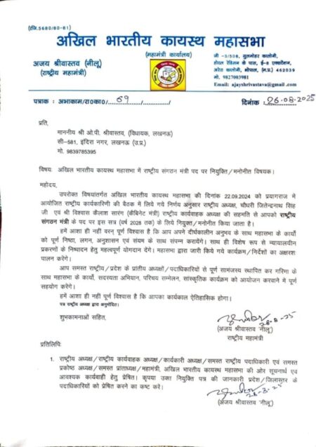 लखनऊ। अखिल भारतीय कायस्थ महासभा ने लखनऊ पूर्वी विधानसभा के विधायक ओ.पी. श्रीवास्तव को राष्ट्रीय संगठन मंत्री (कार्यकाल 2024-2028) नियुक्त किया है।