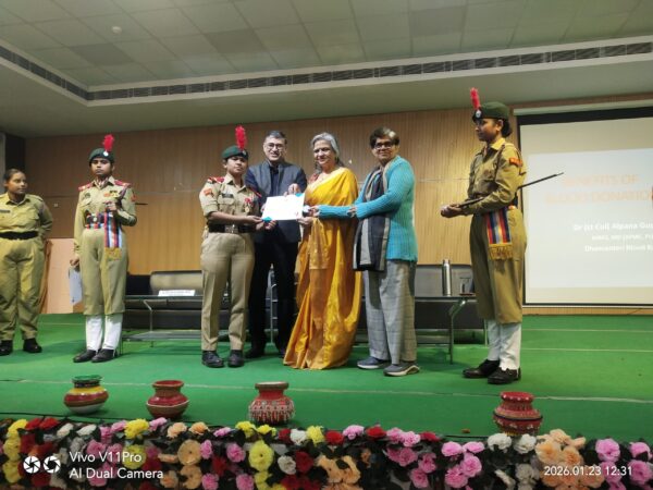 धन्यवाद ज्ञापन लेफ्टिनेंट प्रतिमा शर्मा ने किया। इस अवसर पर इनोवेशन ऑफ चेंज NGO द्वारा स्लम एरिया के बच्चों ने आउटरीच एक्टिविटी के अंतर्गत महाविद्यालय प्रांगण में नेताजी सुभाष चंद्र बोस जी की फोटो पिक्सल आर्ट के माध्यम से बनाई, जिसे देखकर सभी रोमांच से भर गए और इस अवसर पर स्वास्थ्य शिविर में NCC कैडेट्स ने आंखों की जांच, पैथोलॉजी टेस्ट, गाइनोकोलॉजिस्ट कंसल्टेंट, लगभग 15 कैडेट्स एवं 5 प्राध्यापकों ने ब्लड डोनेशन जैसा पुनीत कार्य किया।