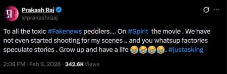 फिल्म ‘स्पिरिट’ से अपने बाहर होने की अफवाहों को बढ़ता देख प्रकाश राज ने एक्स अकाउंट से एक पोस्ट साझा करके लिखा, ‘सभी टॉक्सिक फर्जी खबरें फैलाने वालों को ‘स्पिरिट’ फिल्म के बारे में बताना चाहता हूं। हमने अभी तक मेरे सीन्स की शूटिंग शुरू भी नहीं की है और व्हाट्सएप फैक्ट्रियां कहानियां बना रही हैं। थोड़ी समझदारी दिखाओ। अपनी जिंदगी जियो’।