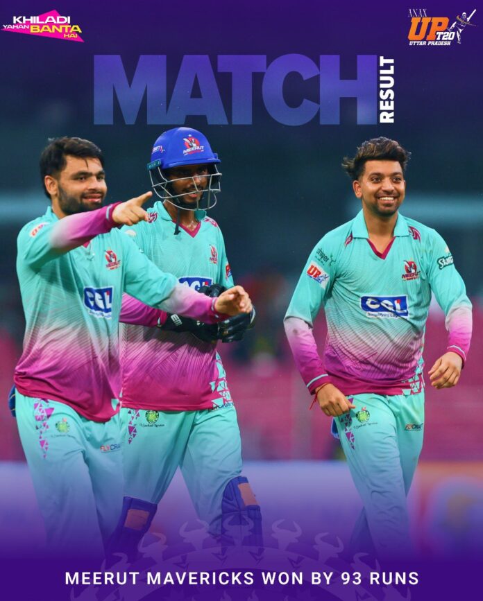 यूपी टी-20 लीग में मेरठ मावरिक्स ने लखनऊ फाल्कन्स को 93 रनों से मात दी. इकाना स्टेडियम में हुए इस मुकाबले में मेरठ ने पहले बल्लेबाजी करते हुए 20 ओवर में 233 रन बनाया.