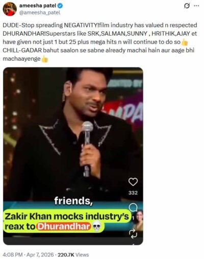 अमीषा पटेल ने भी जाकिर खान के कमेंट पर रिएक्ट करते हुए लिखा, “यार, नेगेटिविटी फैलाना बंद करो. फिल्म इंडस्ट्री ने ‘धुरंधर’ को महत्व दिया है और उसका सम्मान किया है. शाहरुख, सलमान, सनी, ऋतिक, अजय जैसे सुपरस्टार्स ने एक नहीं 25 से भी ज्यादा मेगा हिट दिए हैं. और ये आगे भी जारी रहेगा. सब बहुत पहले ही गदर मचा चुके हैं और आगे भी मचाएंगे.”