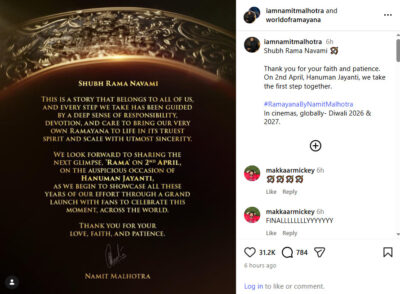 उन्होंने बताया कि ‘रामायण’ केवल एक कहानी नहीं, बल्कि करोड़ों लोगों की आस्था से जुड़ी धरोहर है, जिसे पूरी जिम्मेदारी और श्रद्धा के साथ जीवंत किया जा रहा है। साथ ही उन्होंने यह भी घोषणा की कि 2 अप्रैल, हनुमान जयंती के दिन फिल्म से ‘राम’ की अगली झलक का भव्य वर्ल्ड रिवील किया जाएगा।
