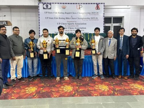लखनऊ। स्थानीय चौक स्टेडियम स्थित लालजी टंडन बहुउद्देशीय हॉल में खेली जा रही यूपी स्टेट रैपिड शतरंज चैंपियनशिप के नौवें एवं अंतिम चक्र में पहले बोर्ड पर वाराणसी के कैंडिडेट मास्टर प्रखर त्रिपाठी ने प्रयागराज के हसनैन सिद्दीकी को पराजित कर पूरा अंक अर्जित किया और कुल 8.5 अंक प्राप्त करते हुए चैंपियनशिप का खिताब अपने नाम किया।