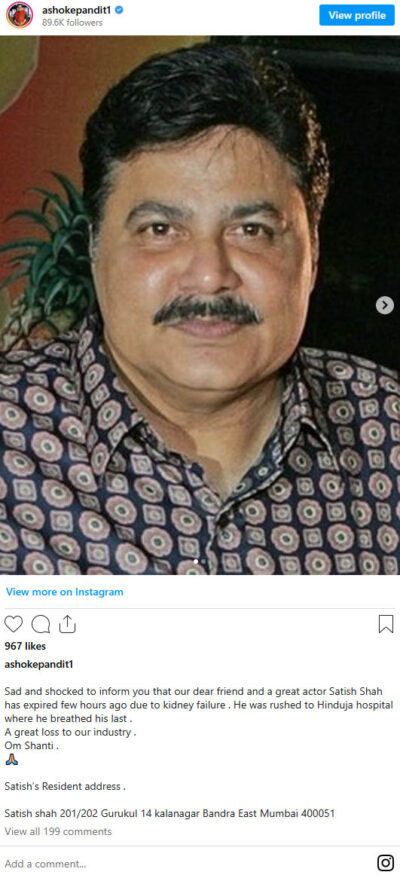 सतीश शाह की फोटो साझा करके अशोक पंडित ने इंस्टाग्राम पर लिखा, “आपको यह बताते हुए दुख और आश्चर्य हो रहा है कि हमारे प्रिय मित्र और एक बेहतरीन अभिनेता सतीश शाह का कुछ घंटे पहले किडनी फेल होने के कारण निधन हो गया।