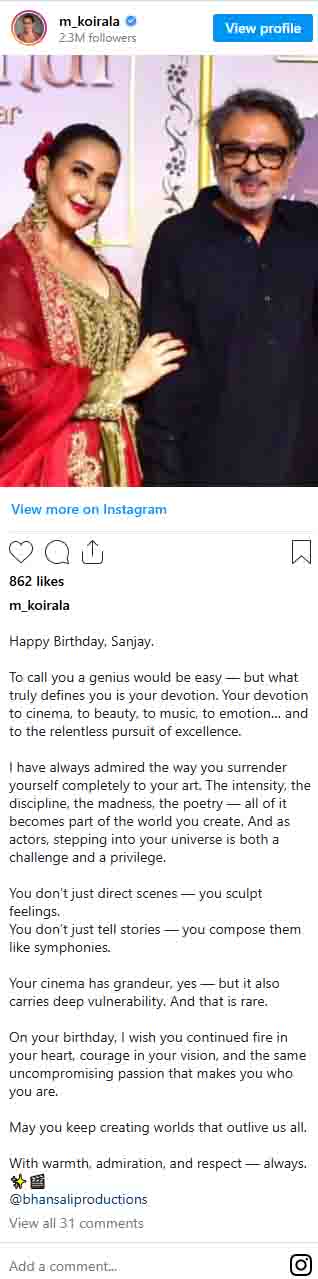 इस खास मौके पर अभिनेत्री मनीषा कोइराला ने सोशल मीडिया पर अपनी भावनाओं को साझा किया और उन्हें एक अनोखे अंदाज में जन्मदिन की शुभकामनाएं दीं। उन्होंने संजय लीला भंसाली के साथ एक तस्वीर साझा करके लिखा, “जन्मदिन की ढेरों शुभकामनाएं, संजय।
